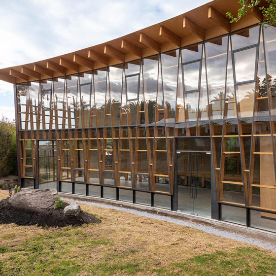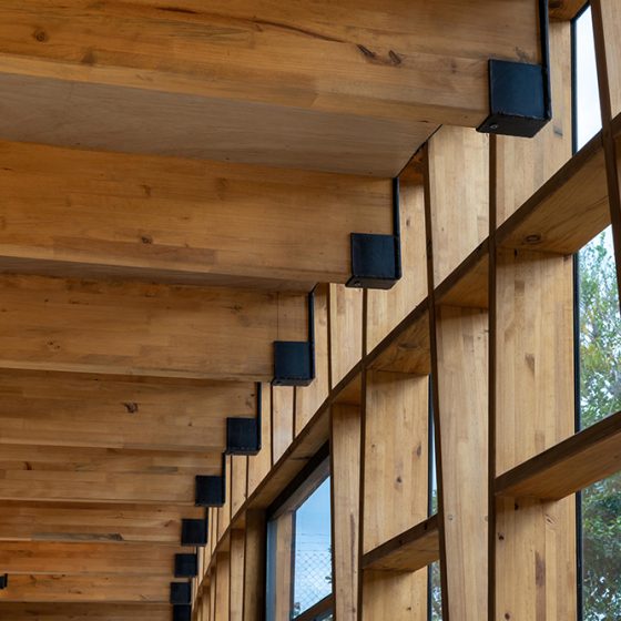 Su fachada está formada por triángulos esbeltos de madera laminada prefabricados en piso y montados sobre una base metálica continua. Esta geometría crea una celosía ligera que tamiza la luz, genera sombra y permite que el espacio respire de manera natural.