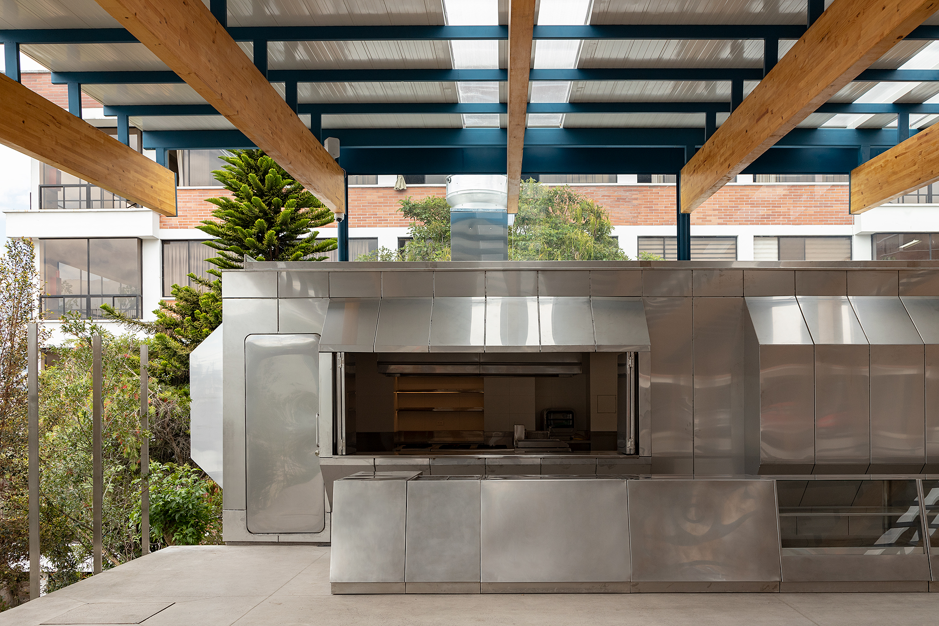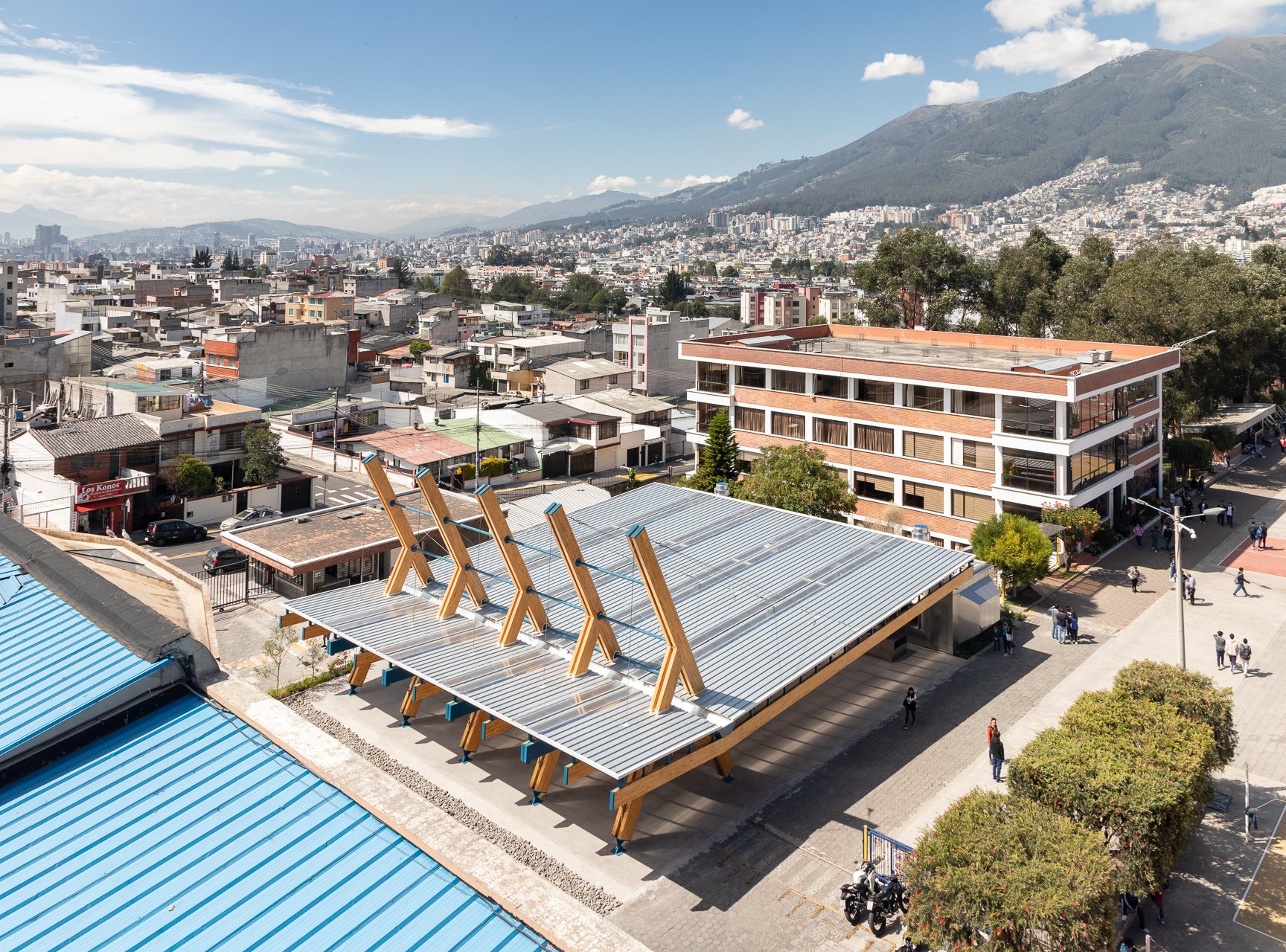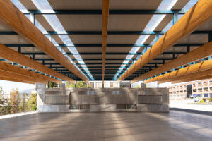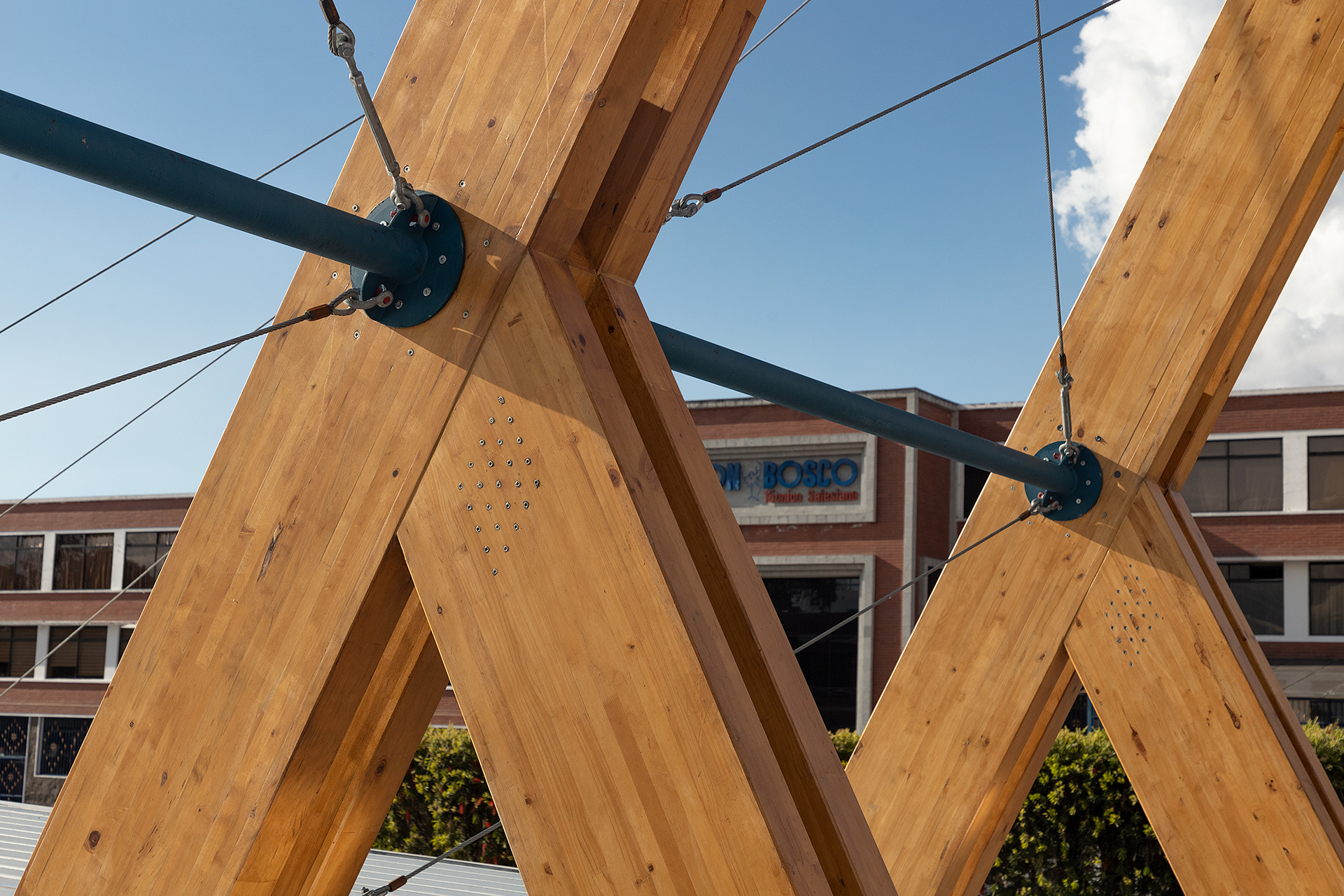 Su exoesqueleto monumental de madera laminada se convirtió en un ícono del campus; una entrada solemne, moderna y profundamente ligada a la identidad salesiana.