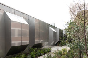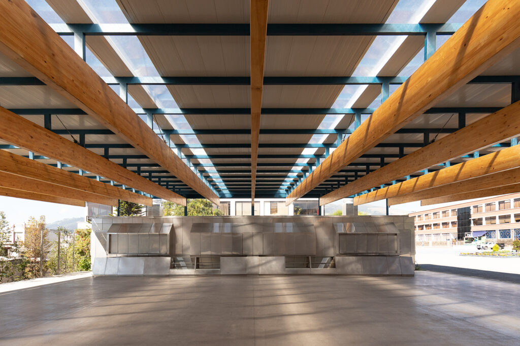 El desafío era monumental: albergar 1.500 estudiantes en un terreno de apenas 500 m², manteniendo la esencia técnica y formativa de la institución. Para lograrlo, se concibió una solución audaz: una estructura principal formada por cinco grandes caballetes de madera laminada, diseñados como mástiles en forma de “Y” invertida, elevándose hasta los 10 metros de altura.